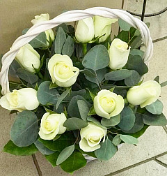 Стильная корзина из 11 нежно-белых роз будет превосходным подарком для любого человека, особенно цветам обрадуется женщина. Букет уместен на свадьбе или на другом важном торжестве. Также его дарят возлюбленным, так как белые розы отлично передают нежность и чистоту человека, отношений и намерений. Стильное украшение цветочной композиции, где к розам добавлены эвкалипт и салал, убедят получателя в вашем непревзойденном вкусе. Легкий запах придется по вкусу дорогому человеку.